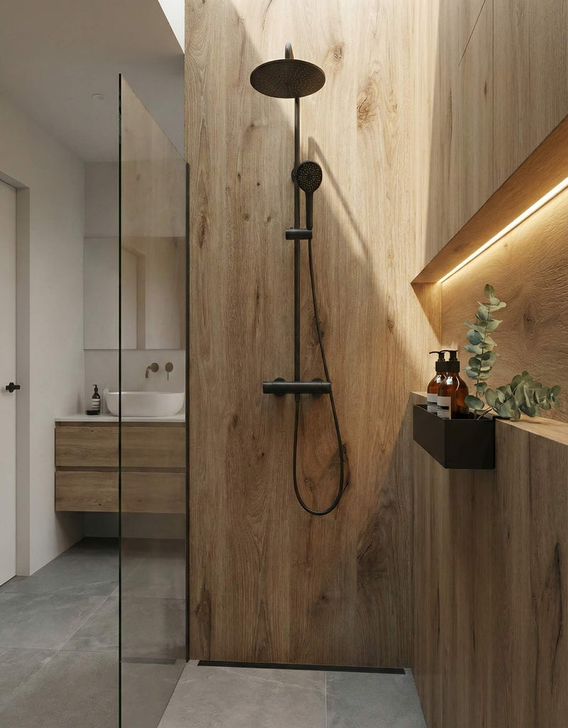 Bei der Montage im Duschbereich muss der Untergrund vorher fachgerecht abgedichtet werden – die Wandpaneele selbst ersetzen keine Abdichtung. Verwende dafür entweder Abdichtungsbahnen oder einen flüssigen Dichtanstrich (bei saugfähigen Untergründen vorher grundieren, dann mindestens zwei Anstriche auftragen). Die Abdichtung sollte bis mindestens 30 cm oberhalb des Brausekopfes reichen.