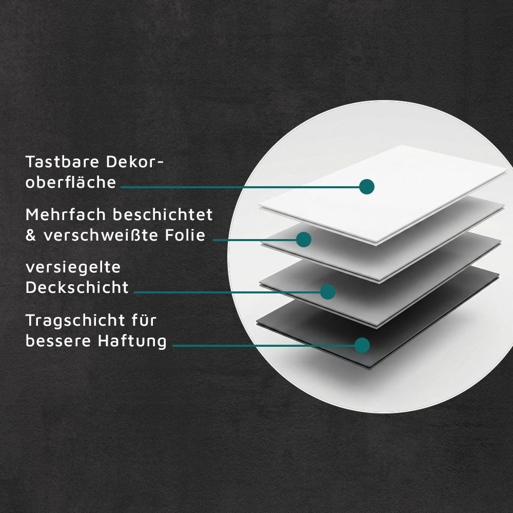 Für die faszinierende Optik der Dekore kommt ein hochwertiger Qualitätsdruck zum Einsatz. Verschiedene Schichten und Lackierungen bilden die robuste Oberfläche mit einer natürlichen haptischen Wirkung, sodass Holz-, Stein- und Betondekore nicht nur optisch, sondern auch fühlbar überzeugen.