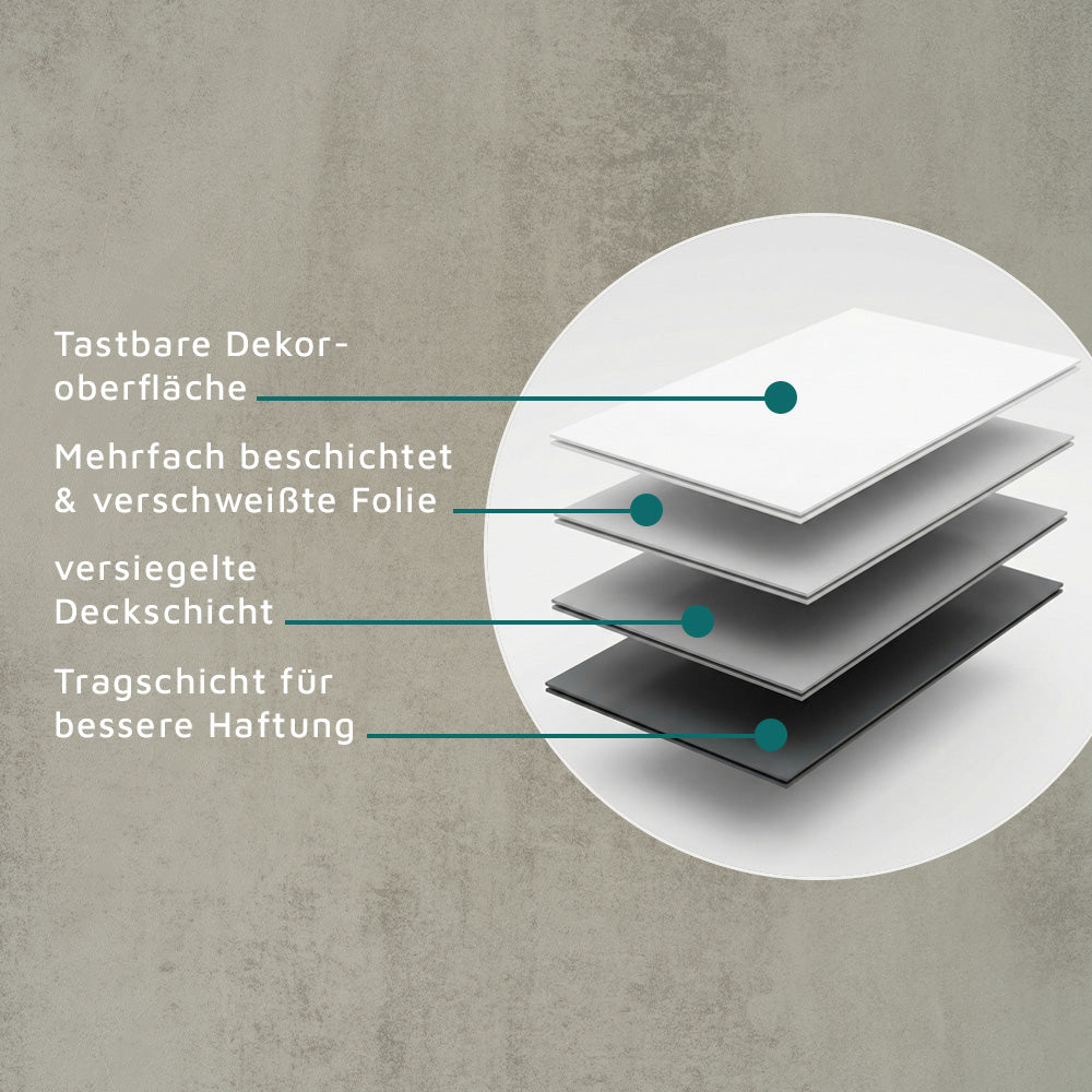 Für die faszinierende Optik der Dekore kommt ein hochwertiger Qualitätsdruck zum Einsatz. Verschiedene Schichten und Lackierungen bilden die robuste Oberfläche mit einer natürlichen haptischen Wirkung, sodass Holz-, Stein- und Betondekore nicht nur optisch, sondern auch fühlbar überzeugen.