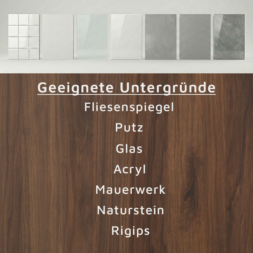 Die Wandverkleidung kannst du direkt auf bestehende Fliesen, Rigips oder Putz kleben. Die Platte ist nicht lichtdurchlässig und scheint daher nicht durch – du kannst sie also auch auf Fliesen oder sehr dunklen Untergründen einsetzen.