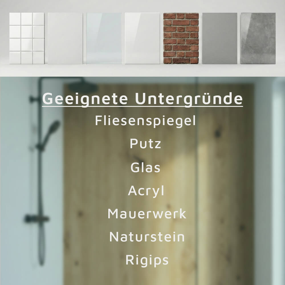 Die Wandverkleidung kannst du direkt auf bestehende Fliesen, Rigips oder Putz kleben. Die Platte ist nicht lichtdurchlässig und scheint daher nicht durch – du kannst sie also auch auf Fliesen oder sehr dunklen Untergründen einsetzen.