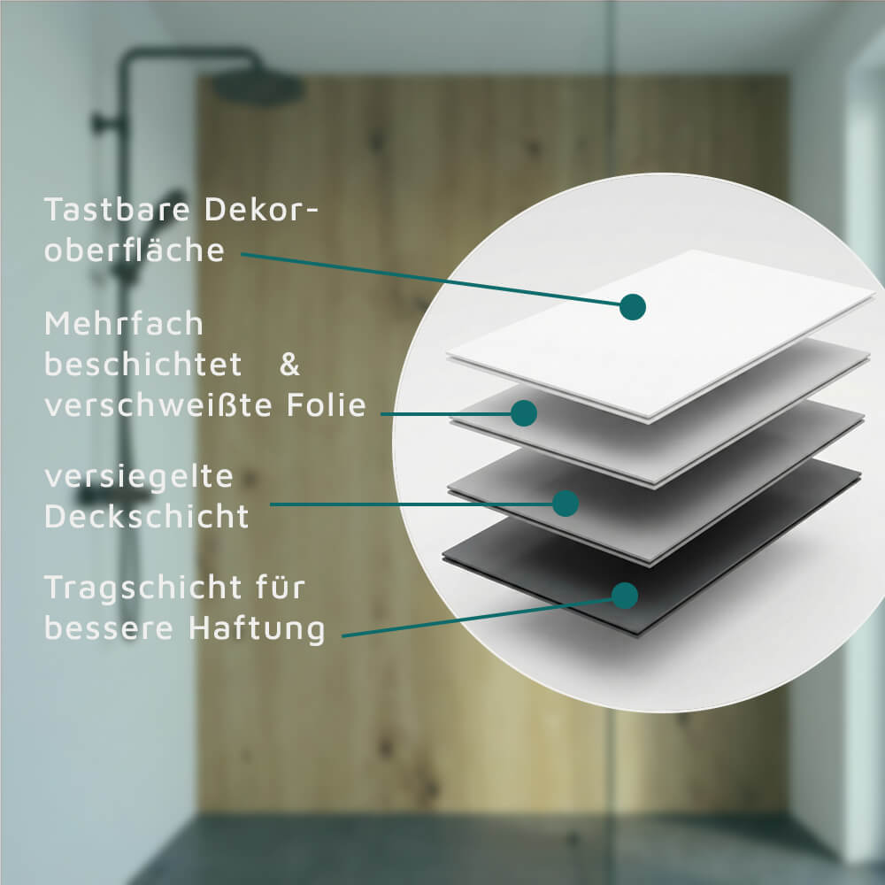 Für die faszinierende Optik der Dekore kommt ein hochwertiger Qualitätsdruck zum Einsatz. Verschiedene Schichten und Lackierungen bilden die robuste Oberfläche mit einer natürlichen haptischen Wirkung, sodass Holz-, Stein- und Betondekore nicht nur optisch, sondern auch fühlbar überzeugen.