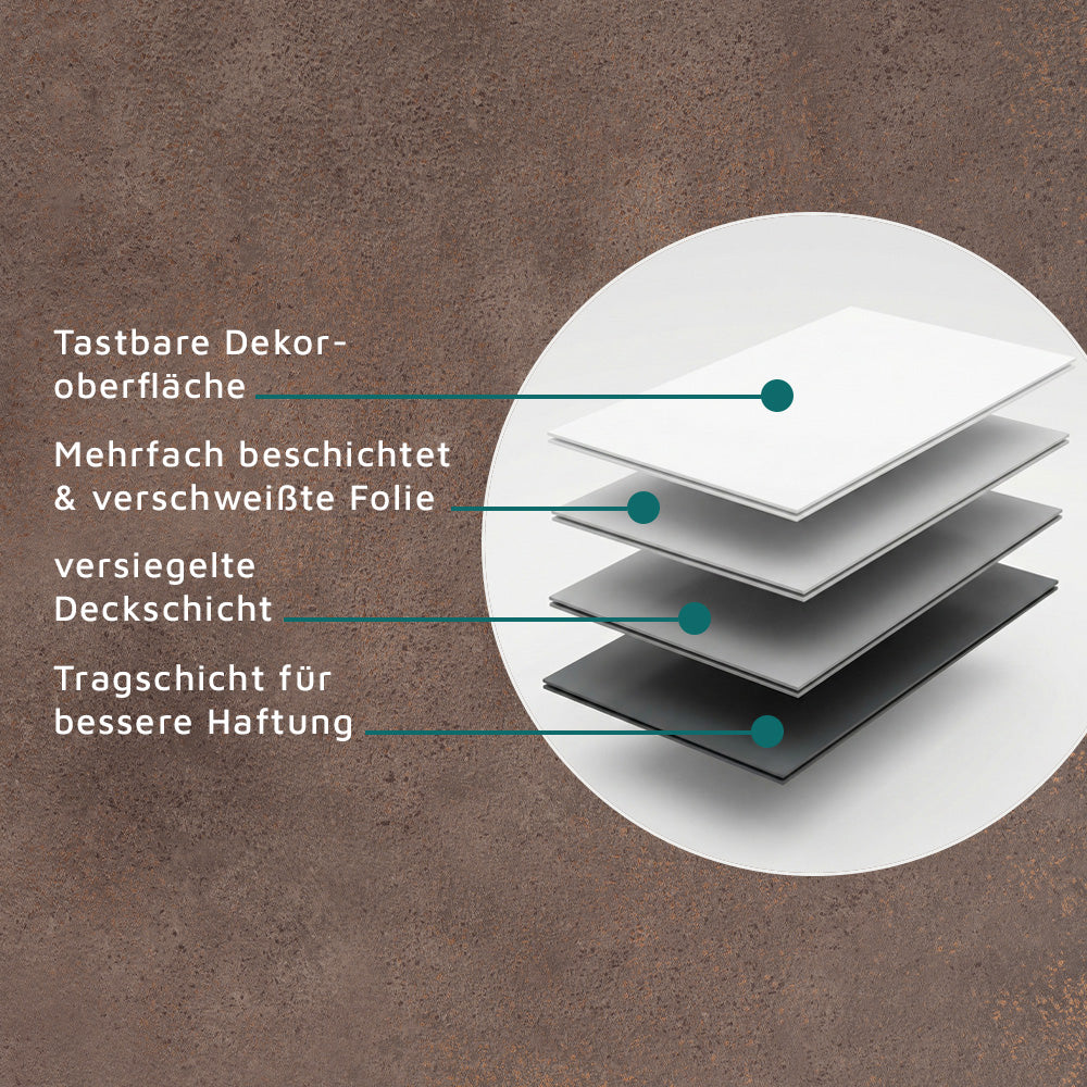 Für die faszinierende Optik der Dekore kommt ein hochwertiger Qualitätsdruck zum Einsatz. Verschiedene Schichten und Lackierungen bilden die robuste Oberfläche mit einer natürlichen haptischen Wirkung, sodass Holz-, Stein- und Betondekore nicht nur optisch, sondern auch fühlbar überzeugen.