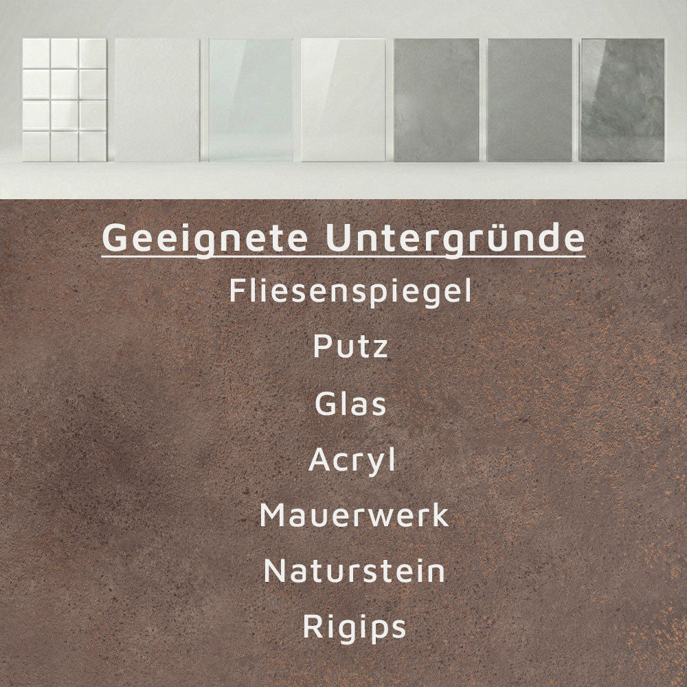 Die Wandverkleidung kannst du direkt auf bestehende Fliesen, Rigips oder Putz kleben. Die Platte ist nicht lichtdurchlässig und scheint daher nicht durch – du kannst sie also auch auf Fliesen oder sehr dunklen Untergründen einsetzen.