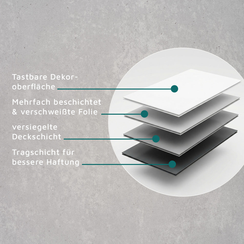 Für die faszinierende Optik der Dekore kommt ein hochwertiger Qualitätsdruck zum Einsatz. Verschiedene Schichten und Lackierungen bilden die robuste Oberfläche mit einer natürlichen haptischen Wirkung, sodass Holz-, Stein- und Betondekore nicht nur optisch, sondern auch fühlbar überzeugen.