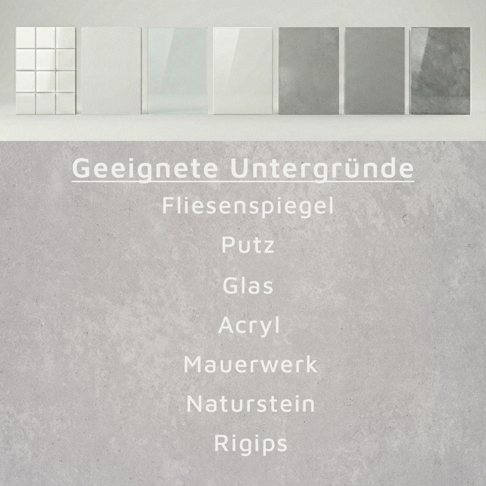 Hinweis für Duschbereiche: Lass die Silikonfugen vor dem ersten Gebrauch der Dusche vollständig trocknen (mindestens 24 Stunden). Achte besonders auf die Stoßkanten zwischen mehreren Duschrückwänden.